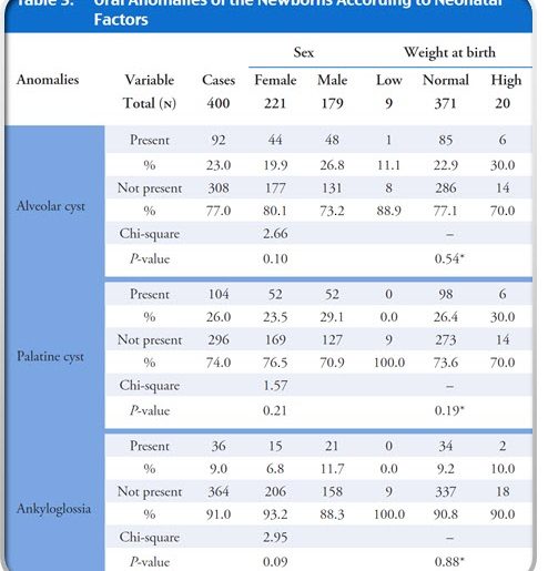 - no statistically difference between the frequency of alveolar and palatine cyst and birth weight similar to other studies