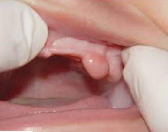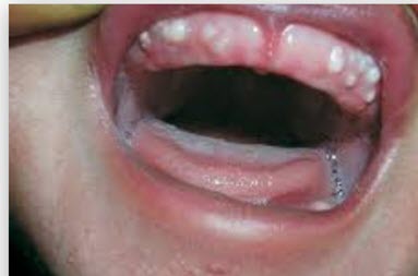 - congenital epulis. pedunculated, soft nodule from 1 mm to several cms in diameter located on gingival margin, proliferation of mesenchymal cells . Very low prevalence les than 1 %. Usually in Maxilla